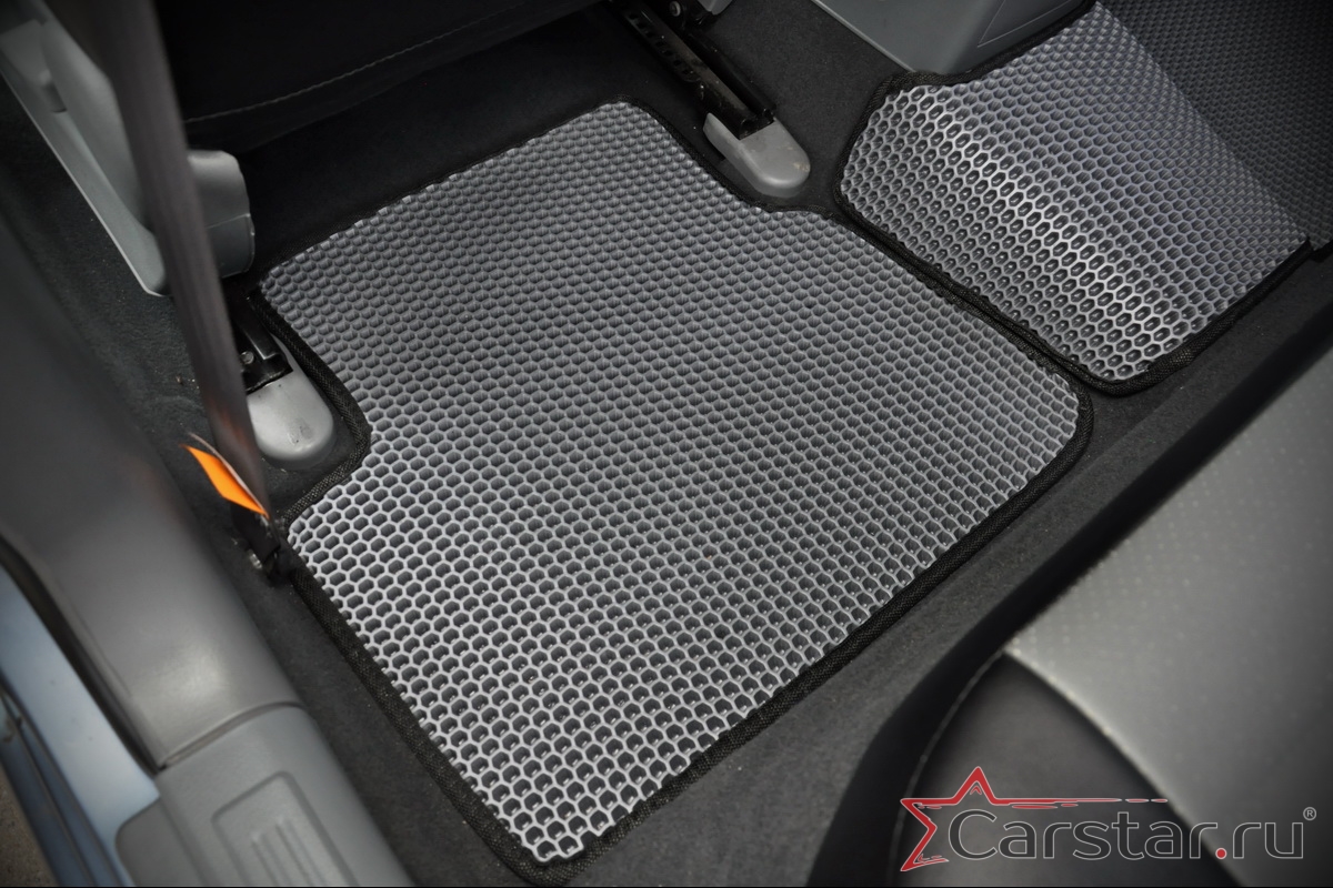 Толщина ковриков EVA составляет 10-12 мм. Глубина ячеек 7-8 мм. Такая толщина ковриков позволяет им служить довольно долго, не протираясь до 3 лет. А благодаря такой глубине ячеек коврик EVA площадью 1 кв.м. способен захватить около 3,5 л жидкости, сохраняя в чистоте вашу обувь и обивку салона.