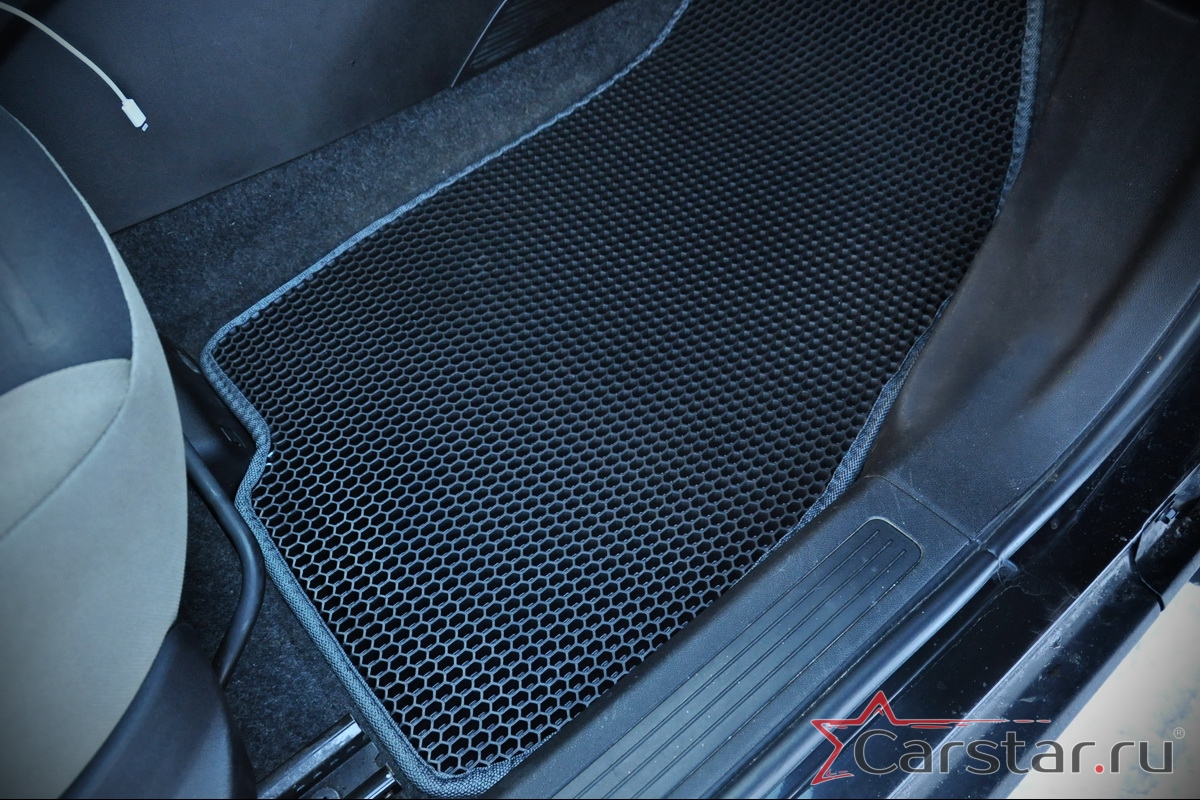 Толщина ковриков EVA составляет 10-12 мм. Глубина ячеек 7-8 мм. Такая толщина ковриков позволяет им служить довольно долго, не протираясь до 3 лет. А благодаря такой глубине ячеек коврик EVA площадью 1 кв.м. способен захватить около 3,5 л жидкости, сохраняя в чистоте вашу обувь и обивку салона.