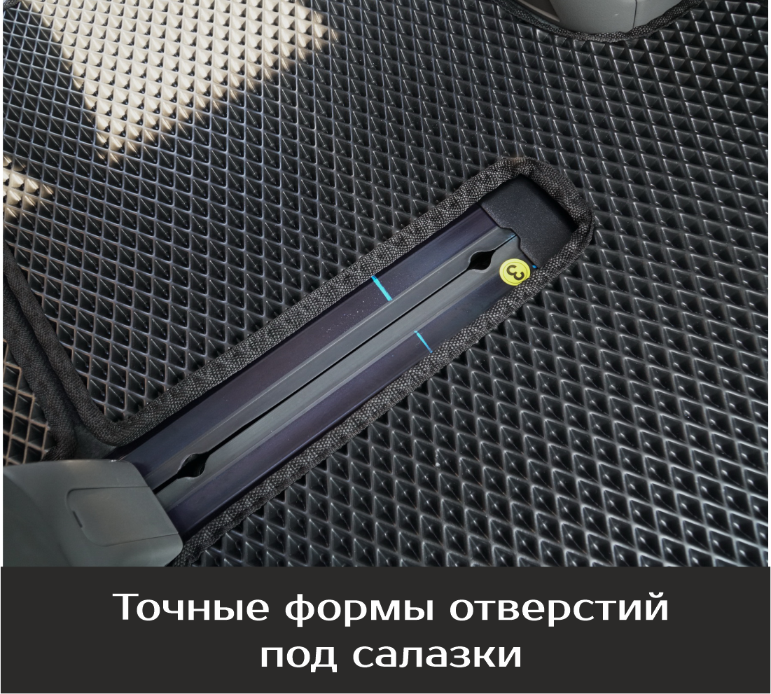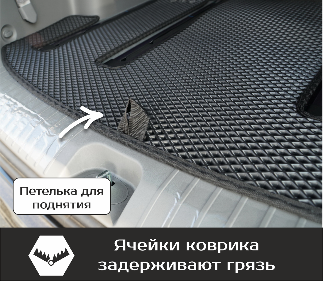 Изделия EVA имеют специальную ячеистую структуру (ячейки глубиной 8 мм), которая эффективно задерживает грязь и воду, оставляя вашу обувь и поверхность обивки салона или багажника абсолютно чистыми. Также эти ячейки очень легко и быстро очищаются без применения специальных инструментов, в том числе, при помощи бесконтактной мойки.