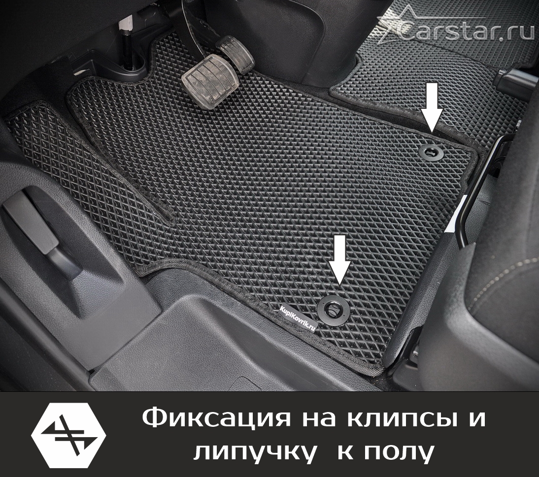 Коврики EVA надёжно крепятся с помощью оригинальных систем фиксации. Благодаря клипсам и липучке коврики защищены от смещений, что обеспечивает комфорт и безопасность вождения. Максимальное удобство также достигается точными, улучшенными лекалами для каждого автомобиля.