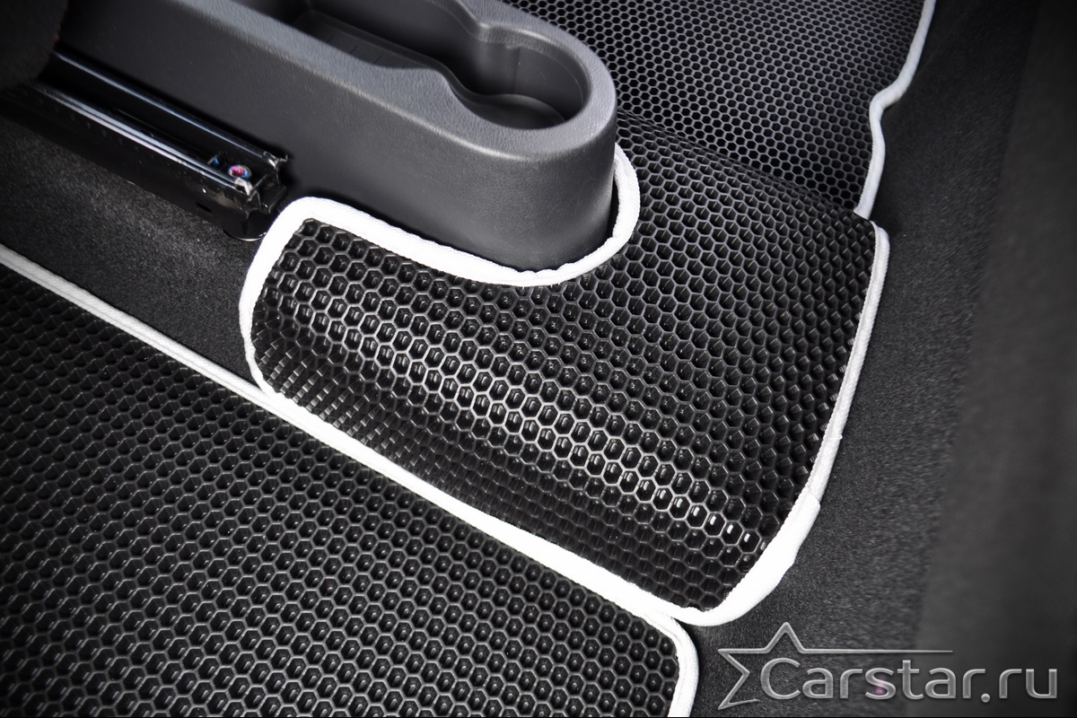 Толщина ковриков EVA составляет 10-12 мм. Глубина ячеек 7-8 мм. Такая толщина ковриков позволяет им служить довольно долго, не протираясь до 3 лет. А благодаря такой глубине ячеек коврик EVA площадью 1 кв.м. способен захватить около 3,5 л жидкости, сохраняя в чистоте вашу обувь и обивку салона.