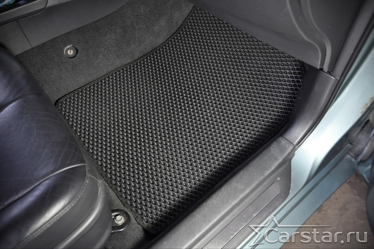 Толщина ковриков EVA составляет 10-12 мм. Глубина ячеек 7-8 мм. Такая толщина ковриков позволяет им служить довольно долго, не протираясь до 3 лет. А благодаря такой глубине ячеек коврик EVA площадью 1 кв.м. способен захватить около 3,5 л жидкости, сохраняя в чистоте вашу обувь и обивку салона.