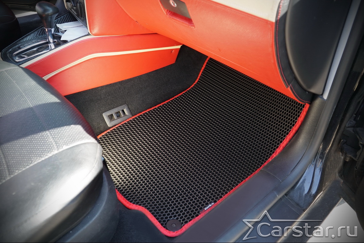Толщина ковриков EVA составляет 10-12 мм. Глубина ячеек 7-8 мм. Такая толщина ковриков позволяет им служить довольно долго, не протираясь до 3 лет. А благодаря такой глубине ячеек коврик EVA площадью 1 кв.м. способен захватить около 3,5 л жидкости, сохраняя в чистоте вашу обувь и обивку салона.